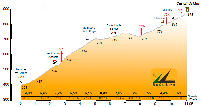 | Altitud: 878 m | Desnivel: 485 m | Longitud: 11.05 km | % máx: 12 % | % medio: 4.4 % | Coeficiente: 87 |