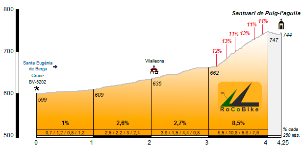 | Altitud: 747 m | Desnivel: 148 m | Longitud: 4.00 km | % máx: 13 % | % medio: 3.7 % | Coeficiente: 31 |