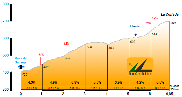 | Altitud: 699 m | Desnivel: 294 m | Longitud: 6.85 km | % máx: 13 % | % medio: 4.3 % | Coeficiente: 48 |