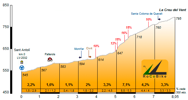 | Altitud: 795 m | Desnivel: 250 m | Longitud: 8.05 km | % máx: 16 % | % medio: 3.1 % | Coeficiente: 40 |