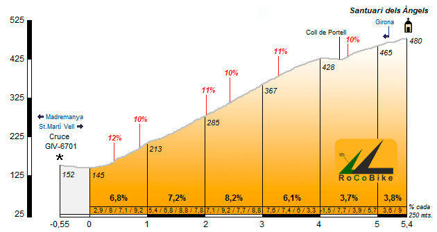 | Altitud: 480 m | Desnivel: 335 m | Longitud: 5.40 km | % máx: 12 % | % medio: 6.2 % | Coeficiente: 65 |