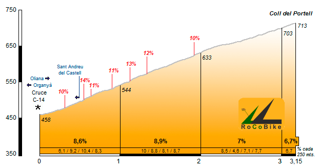 | Altitud: 713 m | Desnivel: 255 m | Longitud: 3.15 km | % máx: 14 % | % medio: 8.1 % | Coeficiente: 63 |