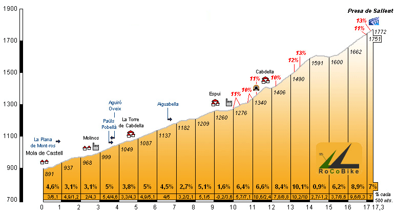 | Altitud: 1772 m | Desnivel: 881 m | Longitud: 17.30 km | % máx: 13 % | % medio: 5.1 % | Coeficiente: 172 |