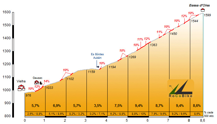 | Altitud: 1599 m | Desnivel: 623 m | Longitud: 8.60 km | % máx: 14 % | % medio: 7.2 % | Coeficiente: 145 |