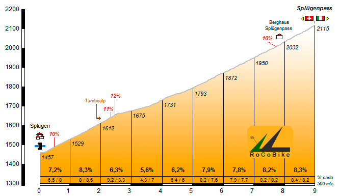 | Altitud: 2115 m | Desnivel: 658 m | Longitud: 9.00 km | % máx: 12 % | % medio: 7.3 % | Coeficiente: 144 |