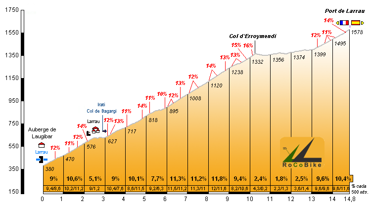 | Altitud: 1578 m | Desnivel: 1198 m | Longitud: 14.80 km | % máx: 16 % | % medio: 8.1 % | Coeficiente: 371 |