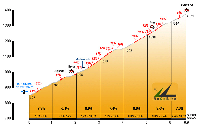 | Altitud: 1373 m | Desnivel: 522 m | Longitud: 6.60 km | % máx: 15 % | % medio: 7.9 % | Coeficiente: 125 |