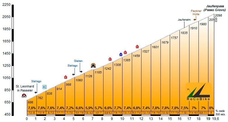 | Altitud: 2098 m | Desnivel: 1412 m | Longitud: 19.60 km | % máx: 10 % | % medio: 7.2 % | Coeficiente: 298 |