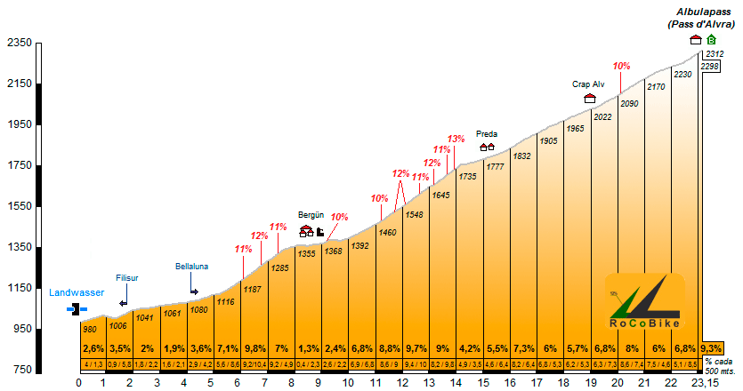 | Altitud: 2312 m | Desnivel: 1332 m | Longitud: 23.15 km | % máx: 13 % | % medio: 5.8 % | Coeficiente: 283 |