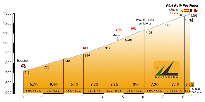 | Altitud: 1292 m | Desnivel: 573 m | Longitud: 8.30 km | % máx: 12 % | % medio: 6.9 % | Coeficiente: 118 |