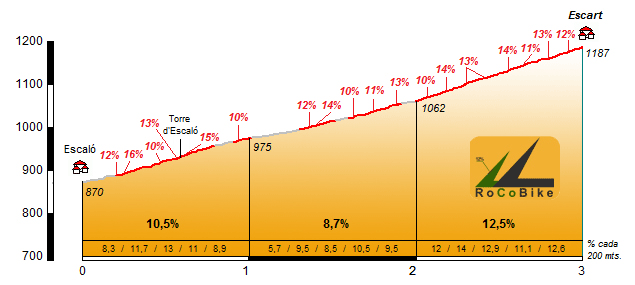 | Altitud: 1187 m | Desnivel: 317 m | Longitud: 3.00 km | % máx: 16 % | % medio: 10.6 % | Coeficiente: 113 |