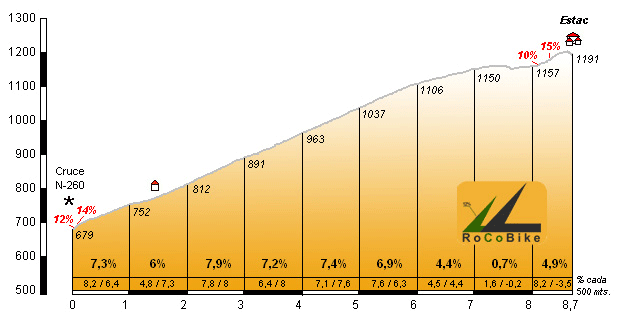 | Altitud: 1191 m | Desnivel: 512 m | Longitud: 8.70 km | % máx: 15 % | % medio: 5.9 % | Coeficiente: 101 |