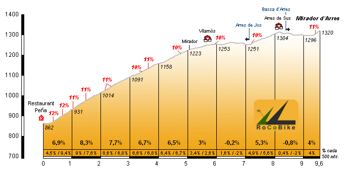 | Altitud: 1320 m | Desnivel: 458 m | Longitud: 9.60 km | % máx: 12 % | % medio: 4.8 % | Coeficiente: 94 |