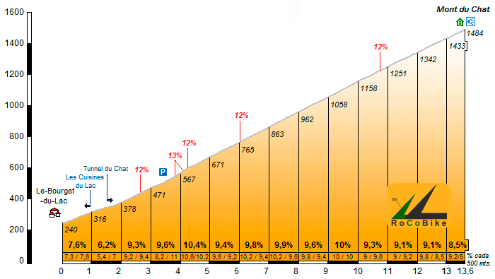 | Altitud: 1484 m | Desnivel: 1244 m | Longitud: 13.60 km | % máx: 13 % | % medio: 9.1 % | Coeficiente: 362 |