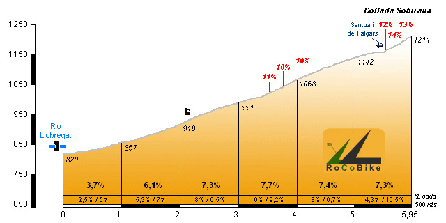 | Altitud: 1211 m | Desnivel: 391 m | Longitud: 5.95 km | % máx: 14 % | % medio: 6.6 % | Coeficiente: 79 |