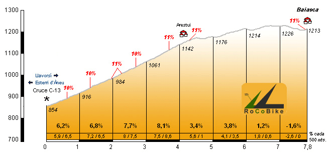 | Altitud: 1213 m | Desnivel: 359 m | Longitud: 7.80 km | % máx: 11 % | % medio: 4.6 % | Coeficiente: 73 |