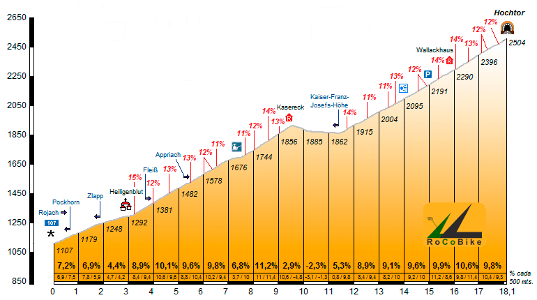 Localización (con mapa): La subida a esta vertiente del Hochtor empieza en el cruce con la localidad de Rojach, que se encuentra en la B107 (Großglockner Straße). Al cabo de 3 kms, en la salida de Heiligenblut, da comienzo la Großglockner Hochalpenstraße, una carretera de pago para los vehículos a motor, pero gratuita para las bicicletas. Tenemos que seguir siempre esa carretera, dejando atrás, pasado el km.11 de la subida, el cruce hacia el Kaiser-Franz-Josefs-Höhe, hasta llegar a la cima del puerto, en la cara sud del túnel que hay en la cima.