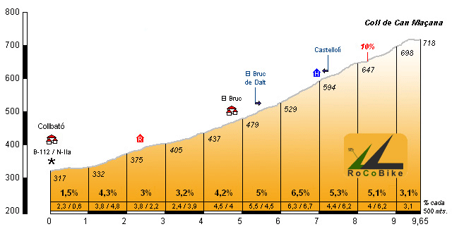 Localización (con mapa): La subida a Can Maçana empieza en la parte baja de la localidad de Collbató, concretamente en el cruce que hay en la B-112 con la N-IIa, que seria la via de servicio de la A-2. Tenemos que seguir rectos por esa carretera paralela a la autovia, hasta llegar al hotel del Bruc, donde tenemos que girar a la derecha, dirección Manresa, para llegar a la casa que da nombre a la cima del puerto.