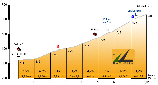 | Altitud: 635 m | Desnivel: 317 m | Longitud: 7.95 km | % máx: 9 % | % medio: 4.0 % | Coeficiente: 46 |