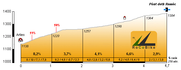 | Altitud: 1384 m | Desnivel: 246 m | Longitud: 4.70 km | % máx: 11 % | % medio: 5.2 % | Coeficiente: 45 |