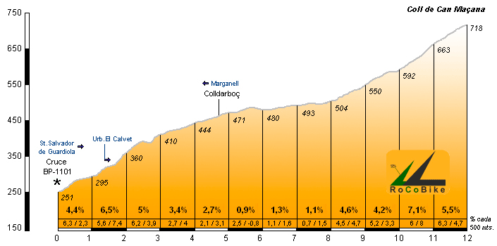 | Altitud: 718 m | Desnivel: 467 m | Longitud: 12.00 km | % máx: 9 % | % medio: 3.9 % | Coeficiente: 74 |