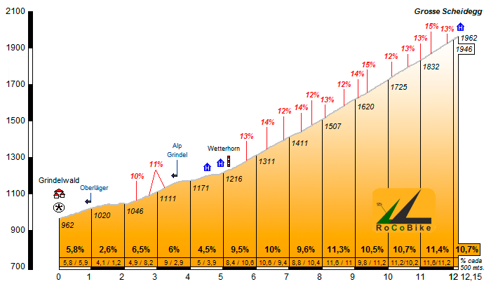 Localización (con mapa): La subida a esta vertiente del Grosse Scheidegg empieza en la rotonda que hay en la entrada de la localidad de Grindelwald. A mano derecha, dejaremos la calle que va hacia la Station Grund y seguiremos dirección al centro (Zentrum). Tenemos que seguir siempre las señales que marcan Oberer Gletscher hasta llegar a la barrera, delante del hotel Wetterhorn, donde empieza la parte más dura. A partir de ahi, ya siempre dirección Meiringen hasta la cima.