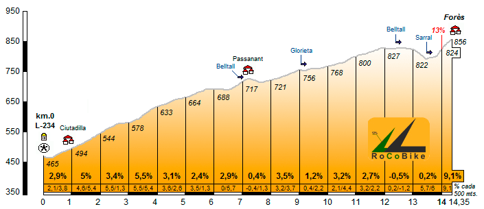 | Altitud: 856 m | Desnivel: 391 m | Longitud: 14.35 km | % máx: 13 % | % medio: 2.7 % | Coeficiente: 62 |