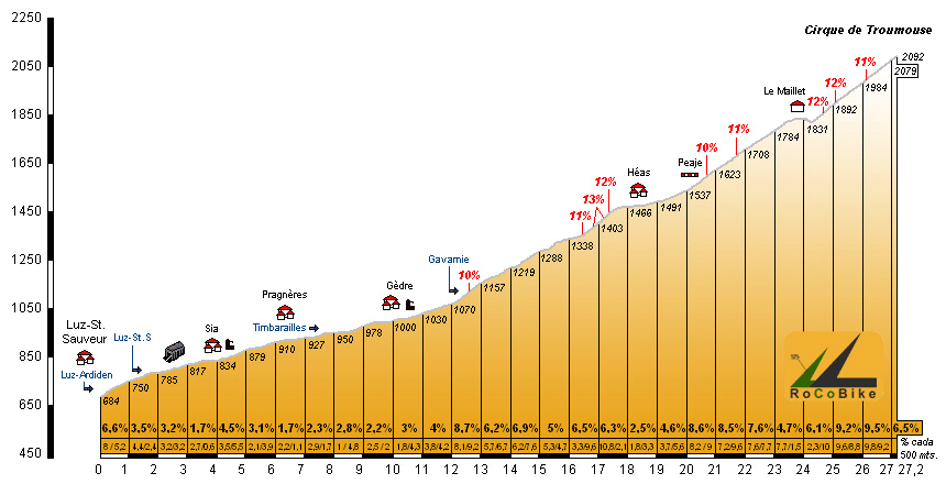 | Altitud: 2092 m | Desnivel: 1408 m | Longitud: 27.20 km | % máx: 13 % | % medio: 5.2 % | Coeficiente: 279 |