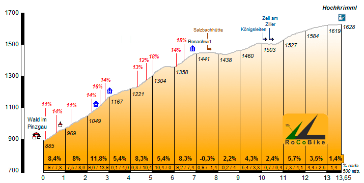 | Altitud: 1628 m | Desnivel: 743 m | Longitud: 13.65 km | % máx: 18 % | % medio: 5.4 % | Coeficiente: 174 |