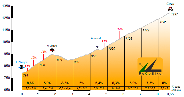 | Altitud: 1297 m | Desnivel: 503 m | Longitud: 8.65 km | % máx: 13 % | % medio: 5.8 % | Coeficiente: 114 |