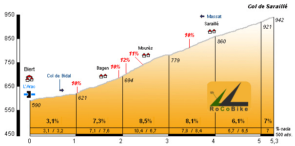 Localización (con mapa): La subida al Col de Saraillé da comienzo en la localidad francesa de Biert, concretamente encima del puente que hay sobre el río Arac, donde tenemos que coger la carretera que sale dirección Saraillé, pueblo que da nombre a la subida, y que una vez llegados ahi, tenemos que seguir a mano derecha para llegar a la cima.