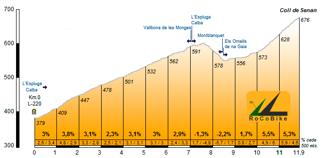 | Altitud: 676 m | Desnivel: 297 m | Longitud: 11.90 km | % máx: 7 % | % medio: 2.5 % | Coeficiente: 49 |