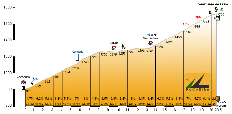 | Altitud: 1720 m | Desnivel: 917 m | Longitud: 20.50 km | % máx: 10 % | % medio: 4.5 % | Coeficiente: 155 |