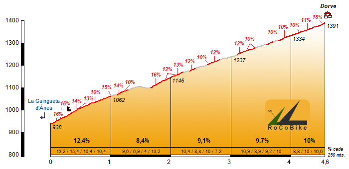 | Altitud: 1391 m | Desnivel: 453 m | Longitud: 4.60 km | % máx: 18 % | % medio: 9.9 % | Coeficiente: 148 |