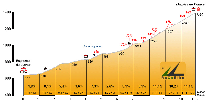 | Altitud: 1390 m | Desnivel: 753 m | Longitud: 10.90 km | % máx: 16 % | % medio: 6.9 % | Coeficiente: 202 |