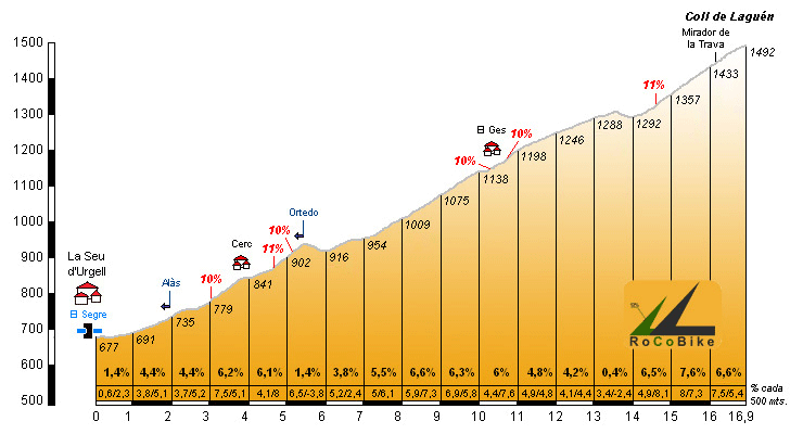 | Altitud: 1492 m | Desnivel: 815 m | Longitud: 16.90 km | % máx: 11 % | % medio: 4.8 % | Coeficiente: 138 |