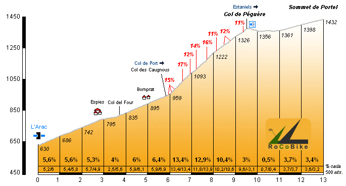 | Altitud: 1432 m | Desnivel: 802 m | Longitud: 13.00 km | % máx: 17 % | % medio: 6.2 % | Coeficiente: 223 |