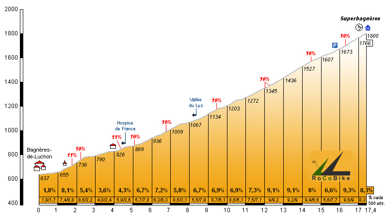 | Altitud: 1800 m | Desnivel: 1163 m | Longitud: 17.40 km | % máx: 11 % | % medio: 6.7 % | Coeficiente: 252 |