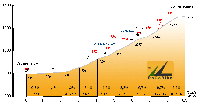 | Altitud: 1301 m | Desnivel: 511 m | Longitud: 8.90 km | % máx: 14 % | % medio: 5.7 % | Coeficiente: 118 |
