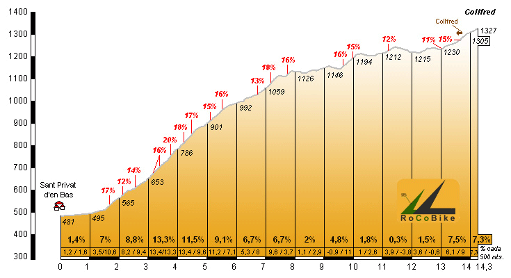 | Altitud: 1327 m | Desnivel: 846 m | Longitud: 14.30 km | % máx: 20 % | % medio: 5.9 % | Coeficiente: 236 |
