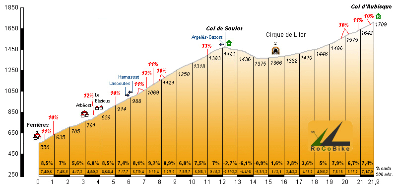 | Altitud: 1709 m | Desnivel: 1159 m | Longitud: 21.90 km | % máx: 12 % | % medio: 5.3 % | Coeficiente: 277 |