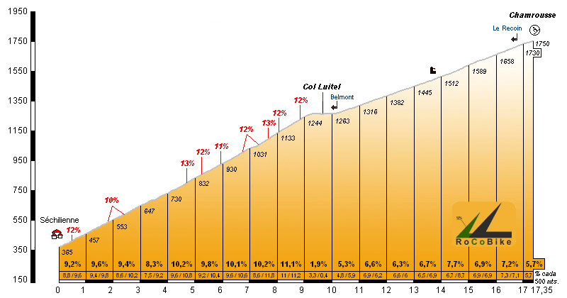 | Altitud: 1750 m | Desnivel: 1385 m | Longitud: 17.35 km | % máx: 13 % | % medio: 8.0 % | Coeficiente: 372 |