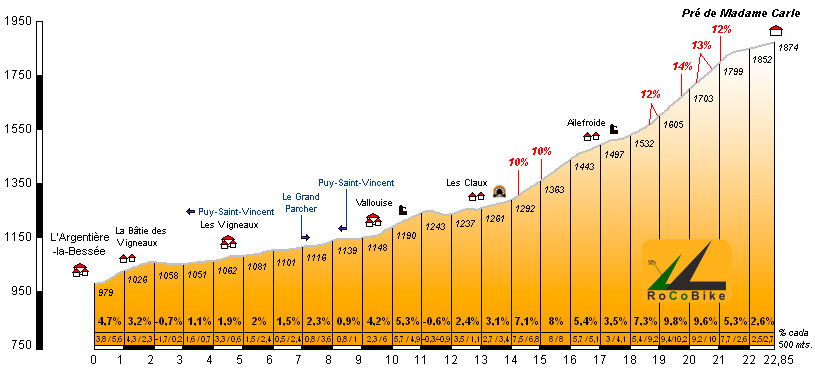 | Altitud: 1874 m | Desnivel: 895 m | Longitud: 22.85 km | % máx: 14 % | % medio: 3.9 % | Coeficiente: 182 |