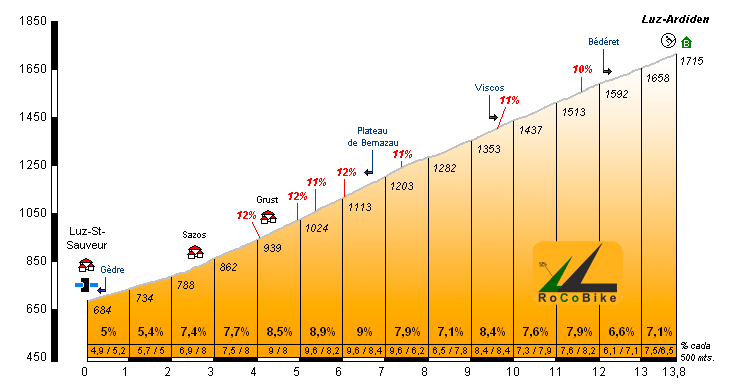 | Altitud: 1715 m | Desnivel: 1031 m | Longitud: 13.80 km | % máx: 12 % | % medio: 7.5 % | Coeficiente: 234 |