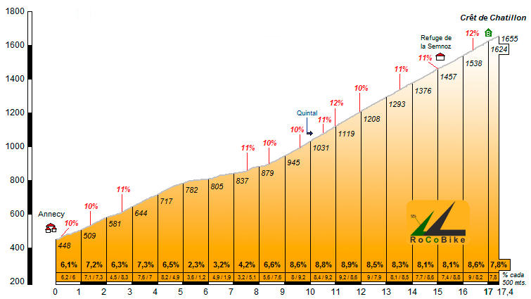 | Altitud: 1655 m | Desnivel: 1207 m | Longitud: 17.40 km | % máx: 12 % | % medio: 6.9 % | Coeficiente: 272 |