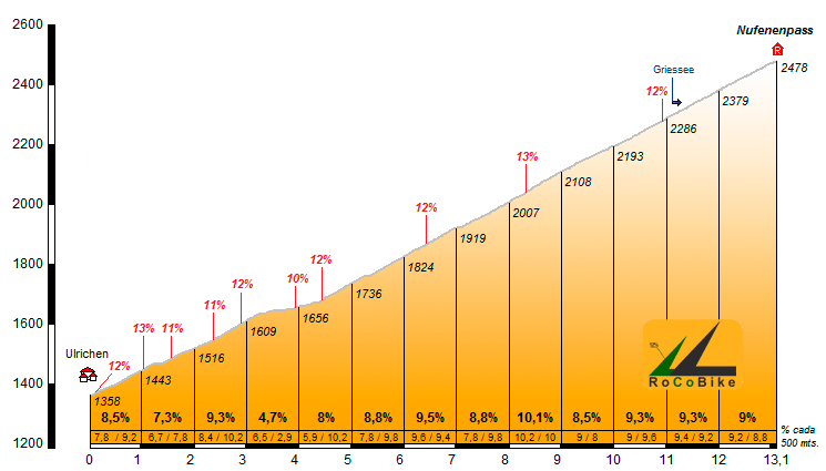 | Altitud: 2478 m | Desnivel: 1120 m | Longitud: 13.10 km | % máx: 13 % | % medio: 8.5 % | Coeficiente: 303 |