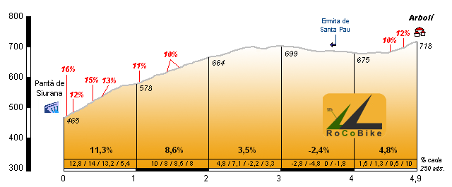 | Altitud: 718 m | Desnivel: 253 m | Longitud: 4.90 km | % máx: 16 % | % medio: 5.2 % | Coeficiente: 77 |