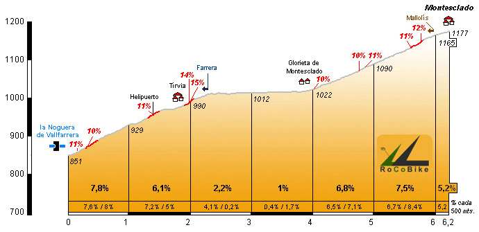 | Altitud: 1177 m | Desnivel: 326 m | Longitud: 6.20 km | % máx: 15 % | % medio: 5.2 % | Coeficiente: 65 |
