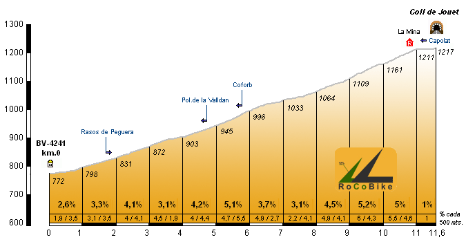 | Altitud: 1217 m | Desnivel: 445 m | Longitud: 11.60 km | % máx: 8 % | % medio: 3.8 % | Coeficiente: 61 |