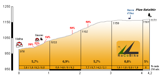 | Altitud: 1171 m | Desnivel: 195 m | Longitud: 4.20 km | % máx: 14 % | % medio: 4.6 % | Coeficiente: 35 |